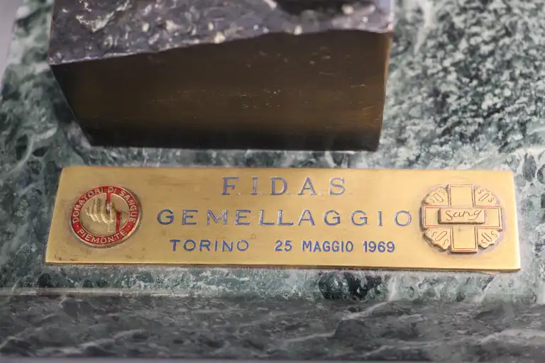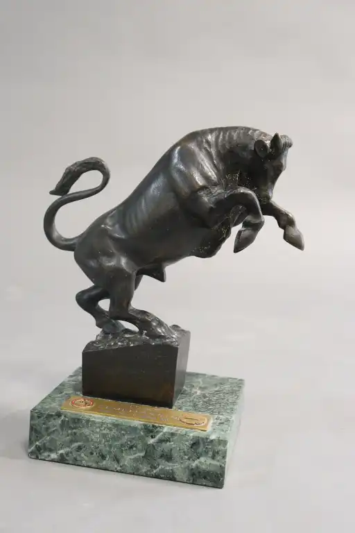 Michelangelo MONTI (1875-1946) D'après. Taureau bondissant. Bronze à patine brune, non signé. Dim. hors terrasse : H. : 23 cm - L. : 7 cm - P. : 22 cm. Sur une base en marbre vert avec cartel en bronze FIDAS GEMELLAGGIO. (Bronze reproduit dans la monographie de l'artiste).