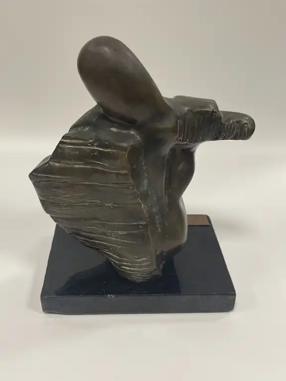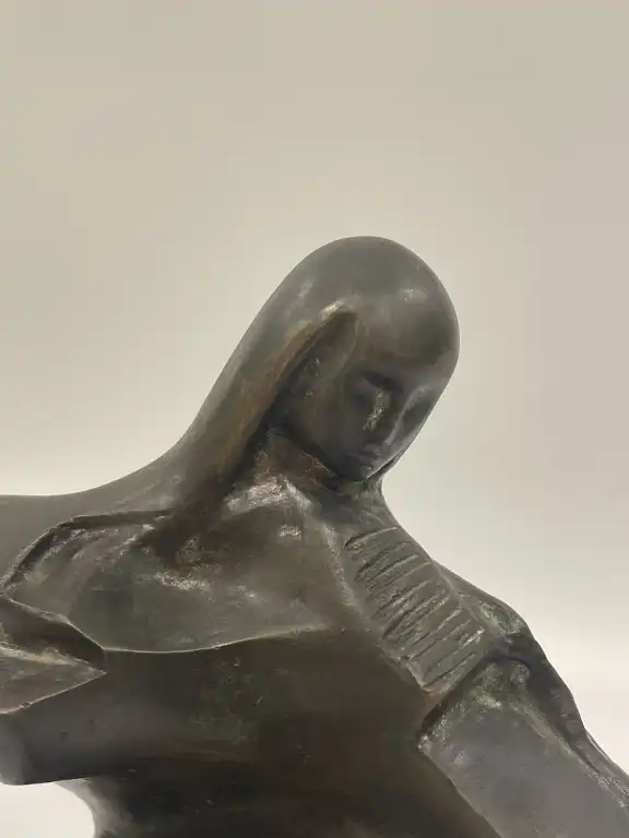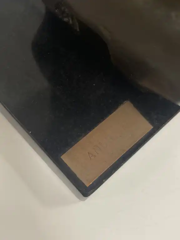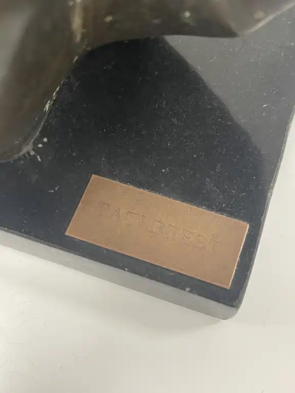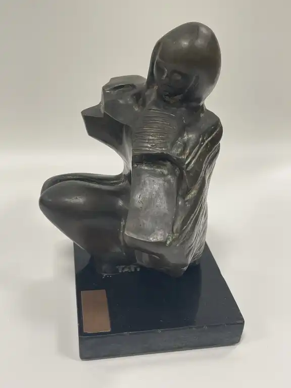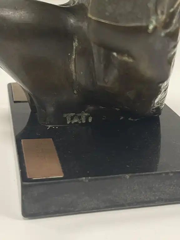 TATI BREST (XXème - XXIème siècle). Anurita. Bronze anthropomorphe à patine brune, sur une base en pierre, plaques de titre et signature, datée 2000 sur le certificat en-dessous. H. hors base : 18.5 cm.