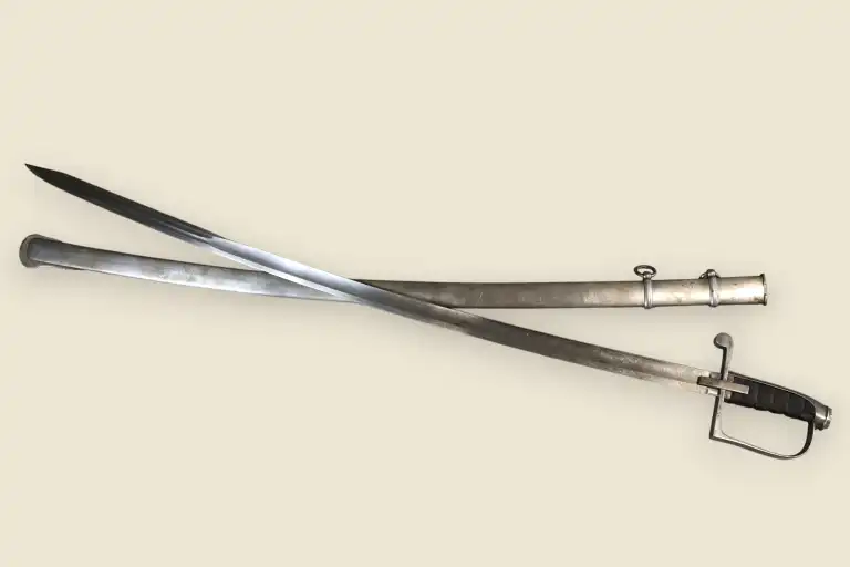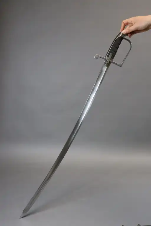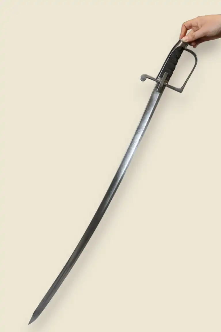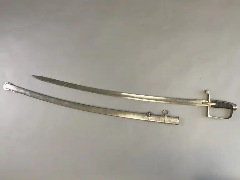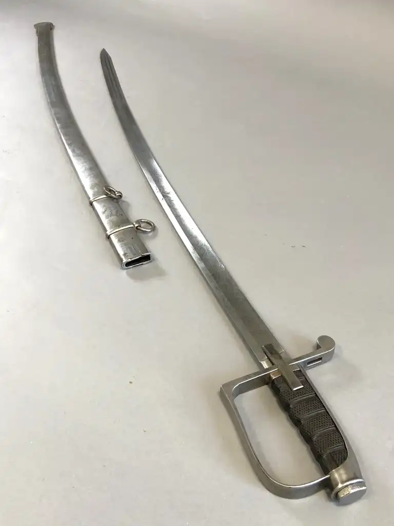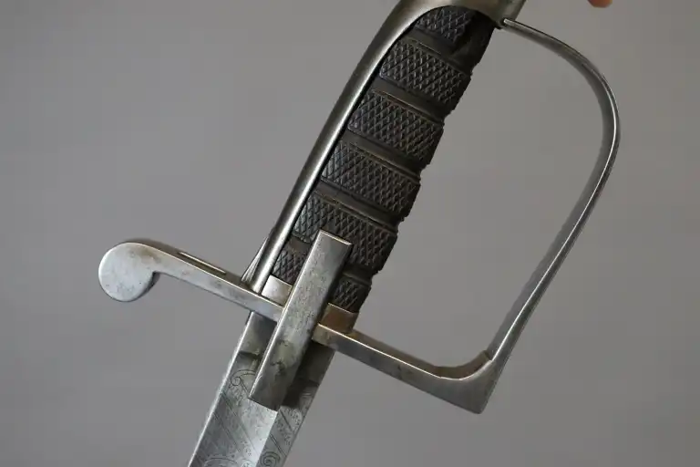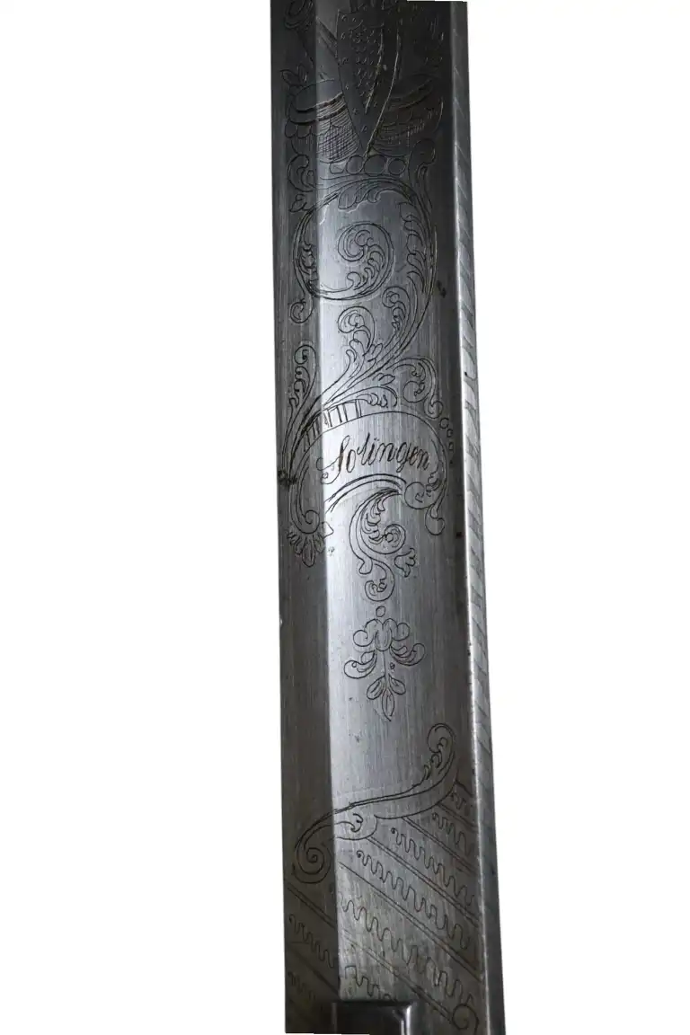 Beau sabre sarde au modèle 1855, garde acier à oreillon carré, fusée ébène quadrillée, belle lame miroir décorée en taille douce de feuillages, drapeaux et fleurs en suite incorporant le nom du fabriquant Solingen. Avec fourreau acier à deux anneaux de bélière.