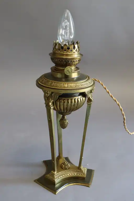 Brûle-parfum en forme d'athénienne en bronze doré et patiné à trois montants surmontés de bustes de caryatides ailées et encadrant au centre un réservoir se terminant par une pomme de pin. Avec accessoires permettant de former bougeoir et lampe. H.: 34 cm