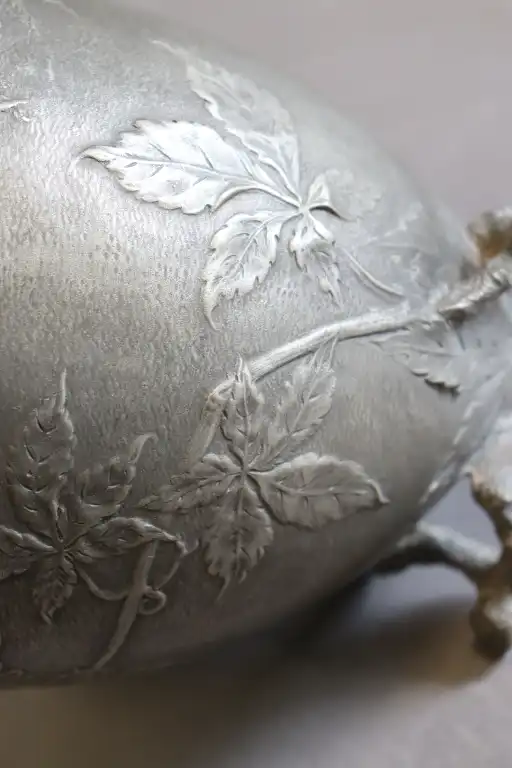 Alexandre CLERGET (1856 - 1931). Cache-pot ou vase en forme d'oeuf et jeune femme en étain. Fonte par Siot Decauville. Signé "A Clerget", cachet du fondeur. H.: 18 cm. (Usures d'usage)