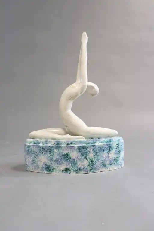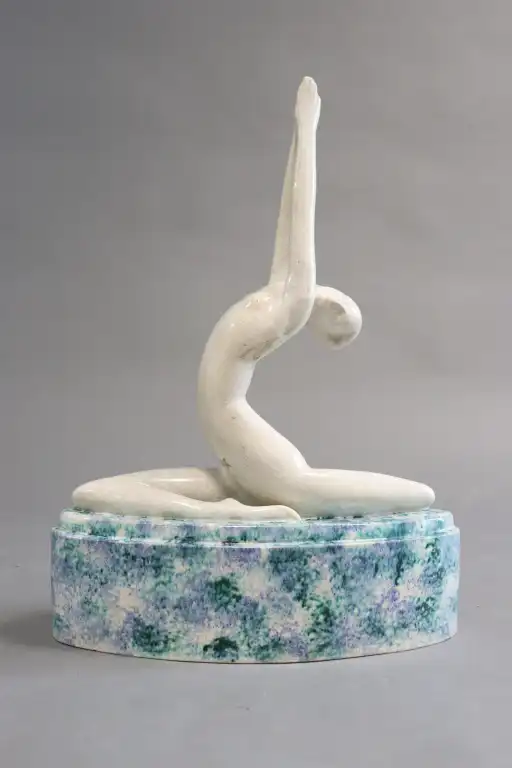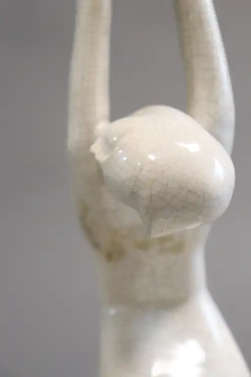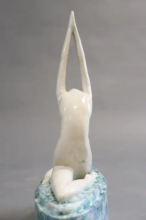 Philippe DEVRIEZ (act. 1920-1992). "Invocation". Sujet en faïence blanche à émail craquelé représentant une danseuse nue très stylisée, en position de grand écart, bras tendus vers le haut sur terrasse ovale. Signé sur la base. H. : 41 cm. (Quelques égrenures)