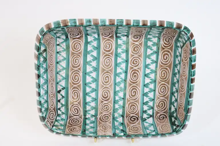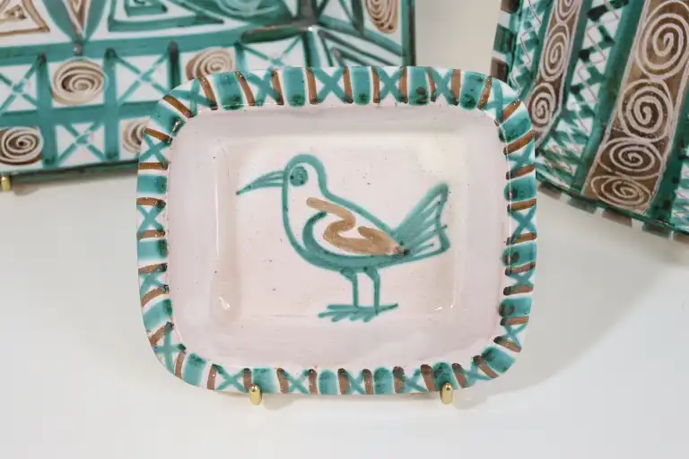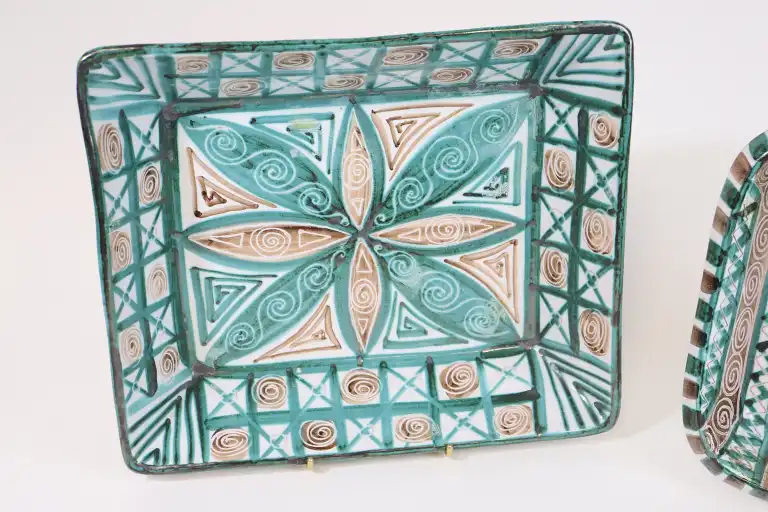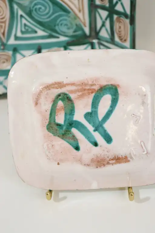 Robert PICAULT (1919-2000). Lot comprenant deux plats et un vide poche en céramique émaillée dans les tons vert et brun. Monogrammés. Dim.: 16 x 13 cm ; 31.5 x 25 cm ; 33.5 x 28 cm. (Petites usures)