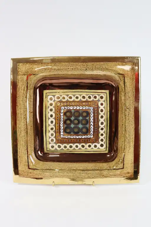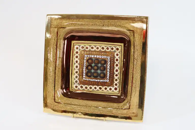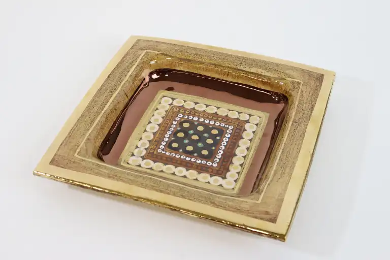 Georges PELLETIER (1938-2024). Grand vide-poche de forme carrée en faïence à décor émaillé, la bordure dorée. Signé au dos. H.: 4 cm - Long.: 30 cm