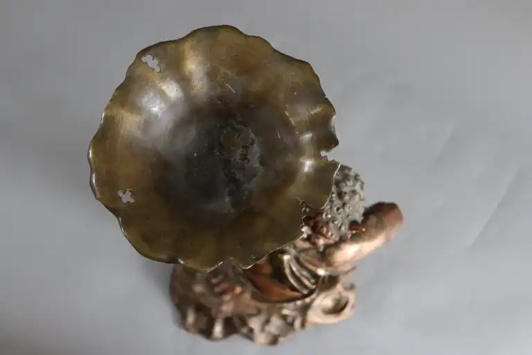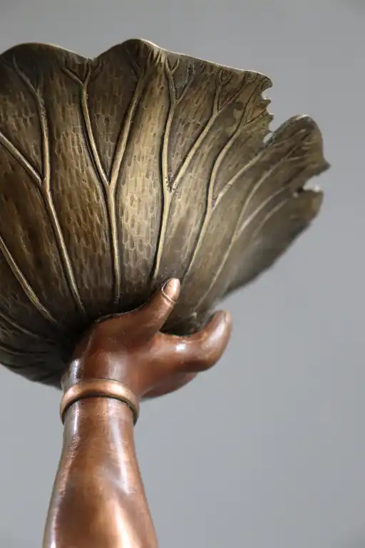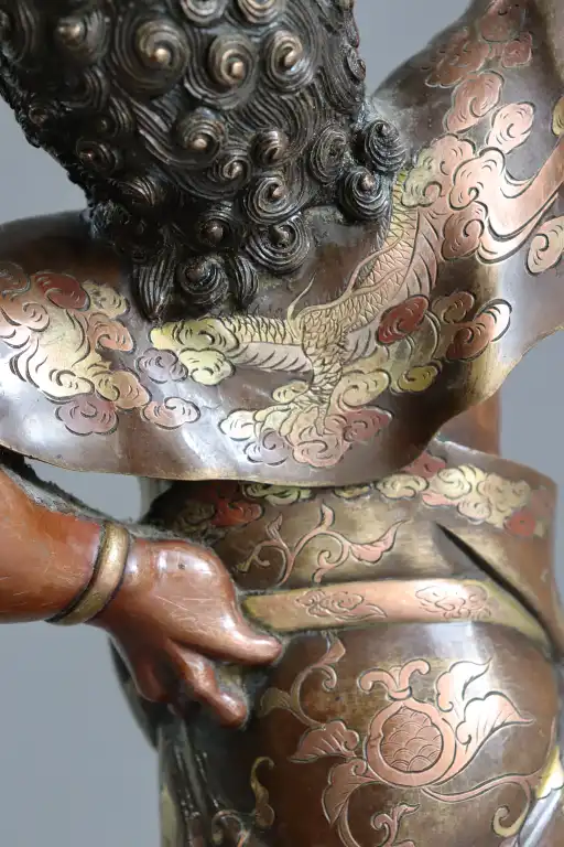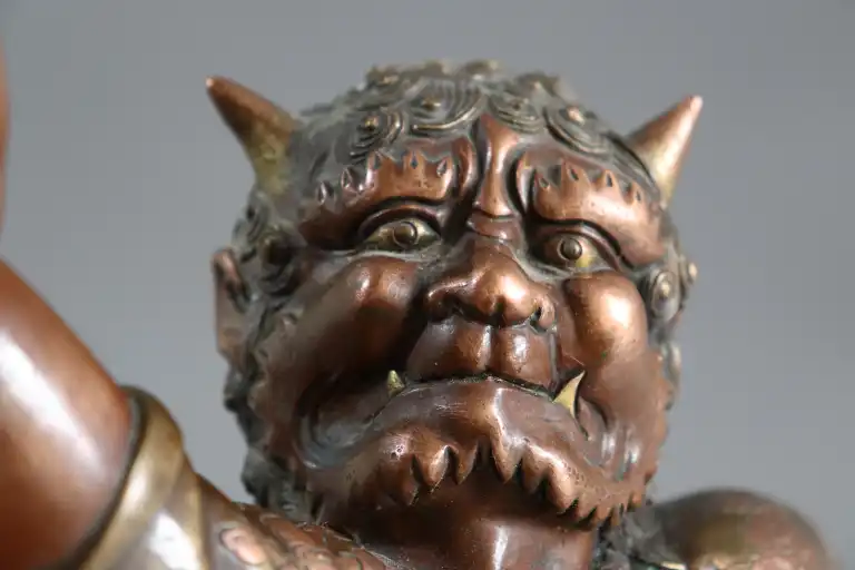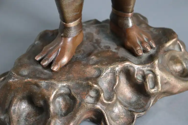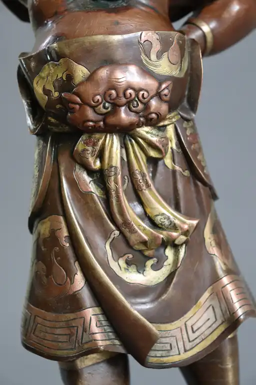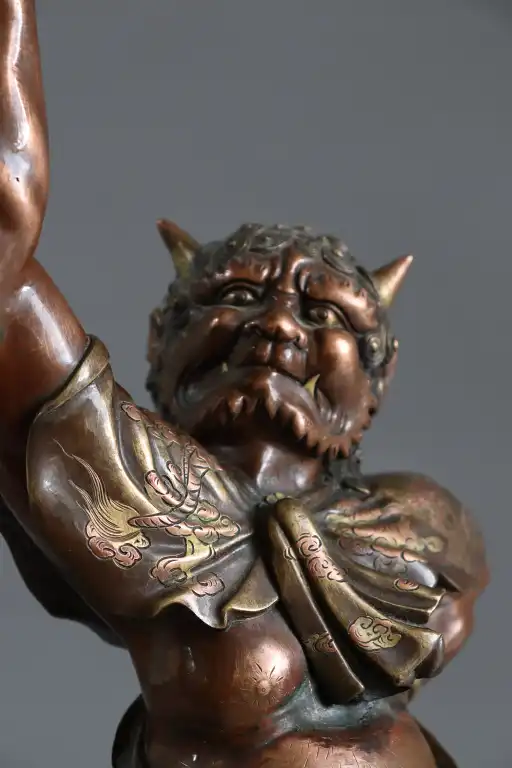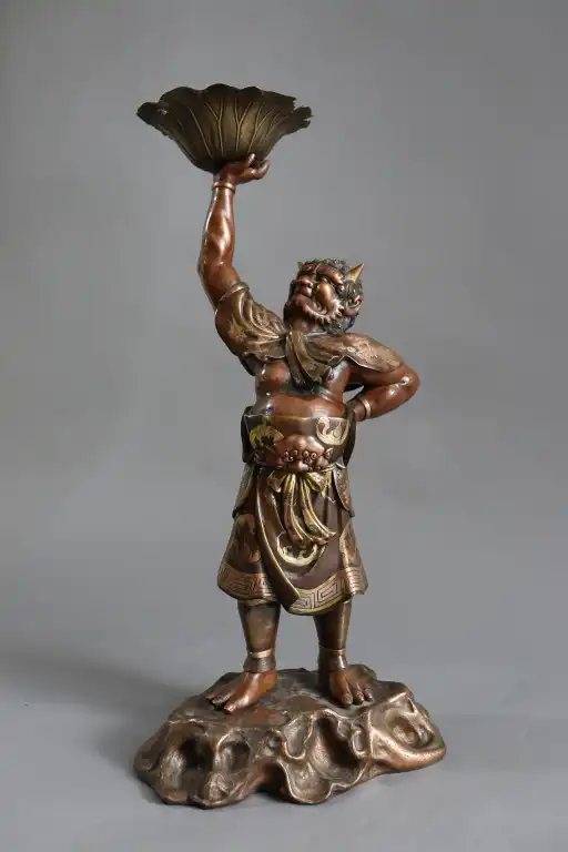 JAPON - Epoque MEIJI (1868 - 1912). Grand okimono en bronze dépatiné, Oni debout sur un tertre tenant de sa main droite une coupe en feuille de lotus. H.: 60 cm