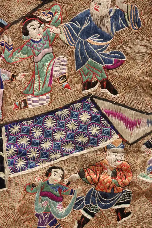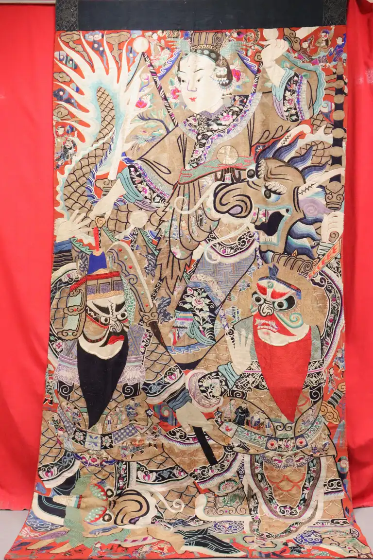CHINE, SICHUAN - Début XXe siècle. Importante tenture en coton rouge brodé aux fils polychromes d'acteurs de théâtre portant des masques et personnage féminin sur un dragon. H.: 385 - L.: 185 cm