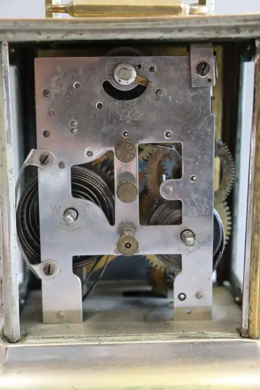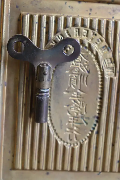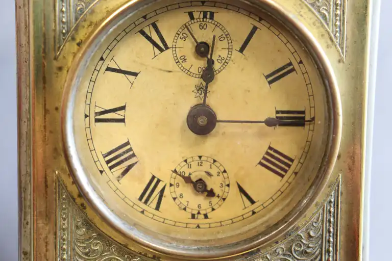INDOCHINE. Pendulette d'officier en métal en métal blanc et laiton repoussé marquée Meyerink & Co. Avec sa clef. H.: 14, cm- L.: 13.5 cm - P.: 10 cm. (Dorure en partie effacée)