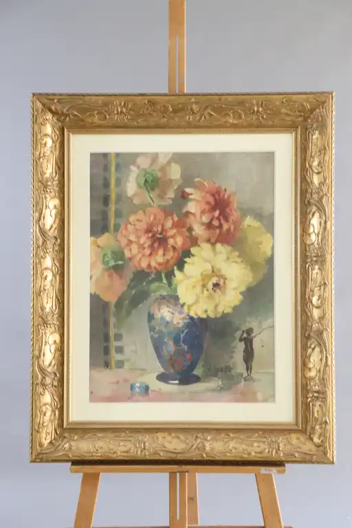 Jeanne ESCARFAIL (1890-1971). Fleurs dans un vase. Aquarelle, signée en bas à droite. 45 x 62 cm (à vue). Cadre doré à décor floral dans le goût Art Nouveau.