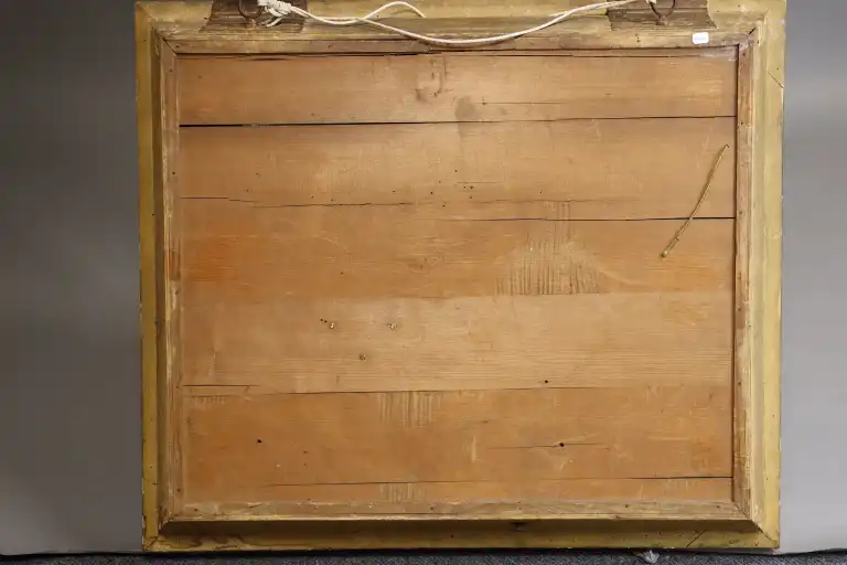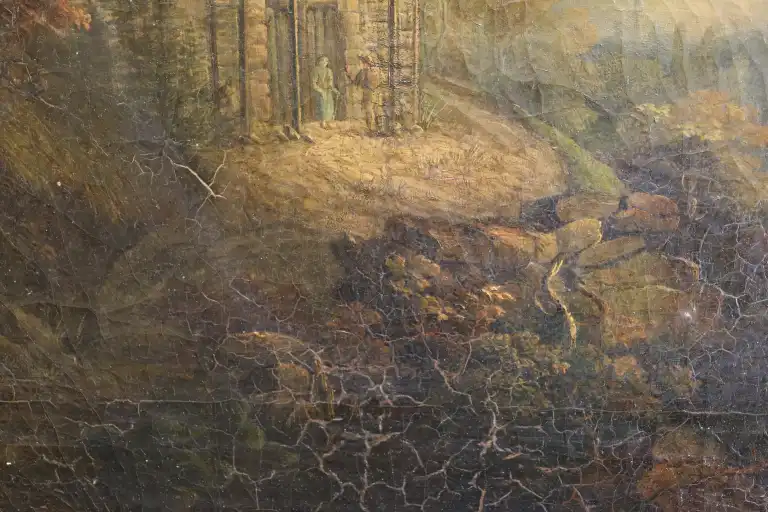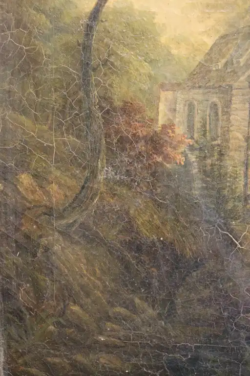 Ecole du XIXème siècle. Tableau horloge figurant une chapelle en bord de rivière. Huile sur toile. Avec balancier. 52 x 63 cm (hors cadre). (Restaurations à la toile et petites craquelures, vendu sans garantie de fonctionnement)