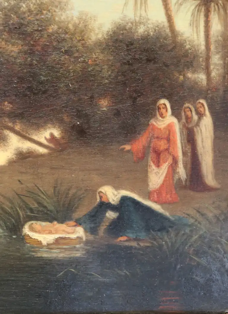 Théodore FRERE (1814-1888). Moïse sauvé des eaux. Huile sur panneau, signée en bas à gauche. 18 x 25.5 cm. Dans un cadre en bois et stuc doré