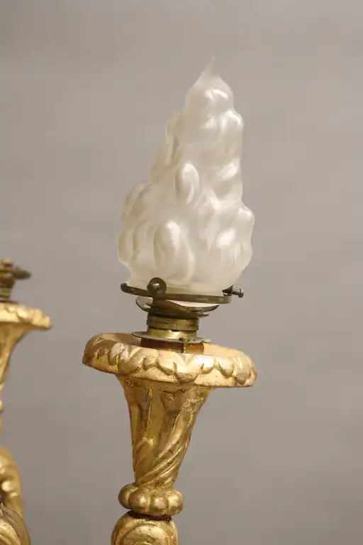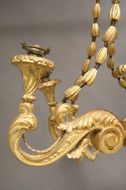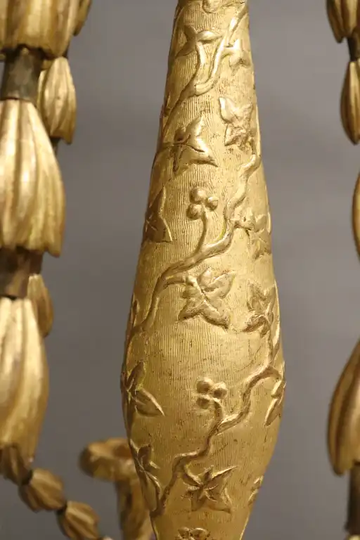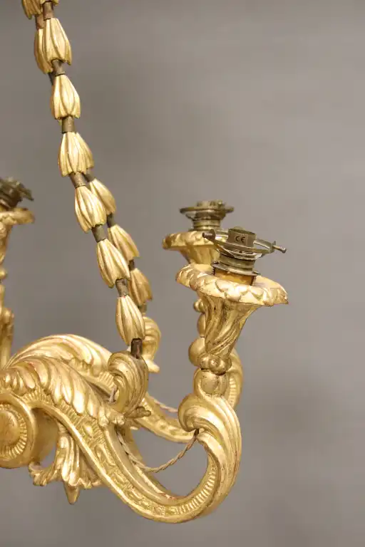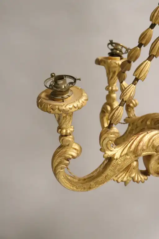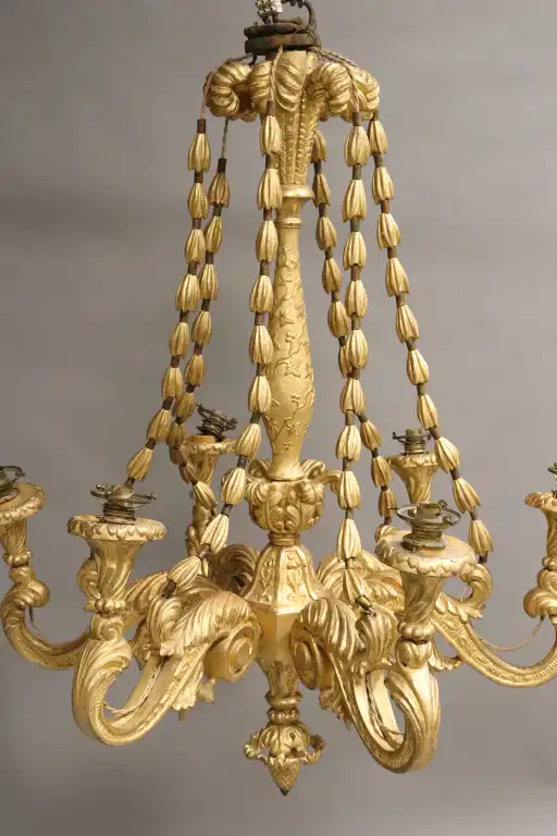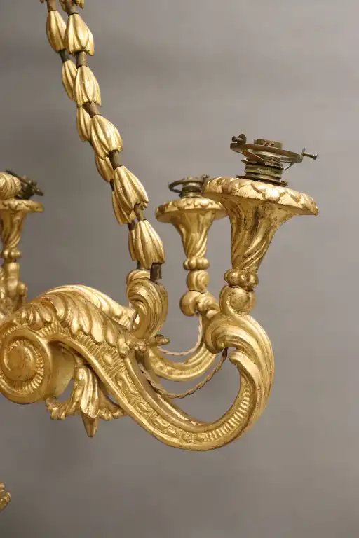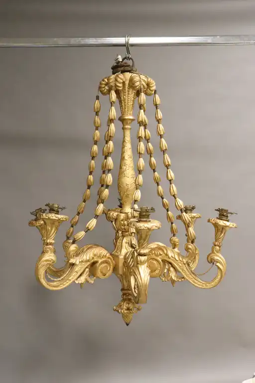 Lustre en bois mouluré, sculpté et doré à fût central en balustre, à décor de lierre et pomme de pin à l’amortissement, portant six bras lumières à feuilles d’acanthe. Style Louis XIV. Electrifié. H.: 92 cm - Diam.: 75 cm. (Usures, manques, accidents et restaurations)