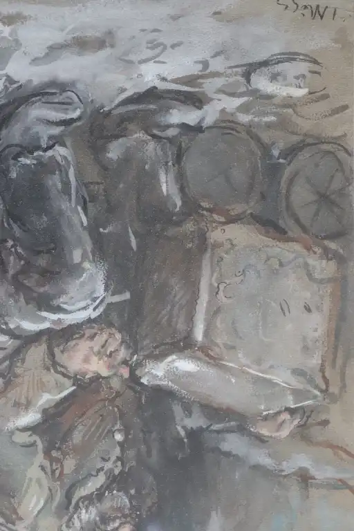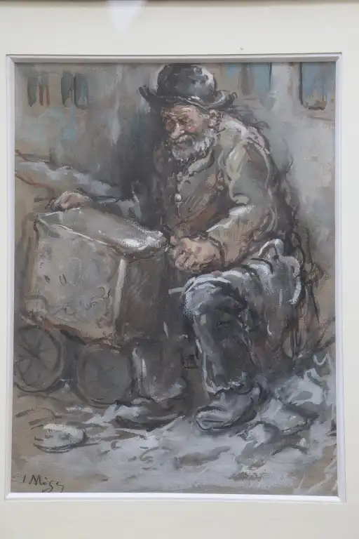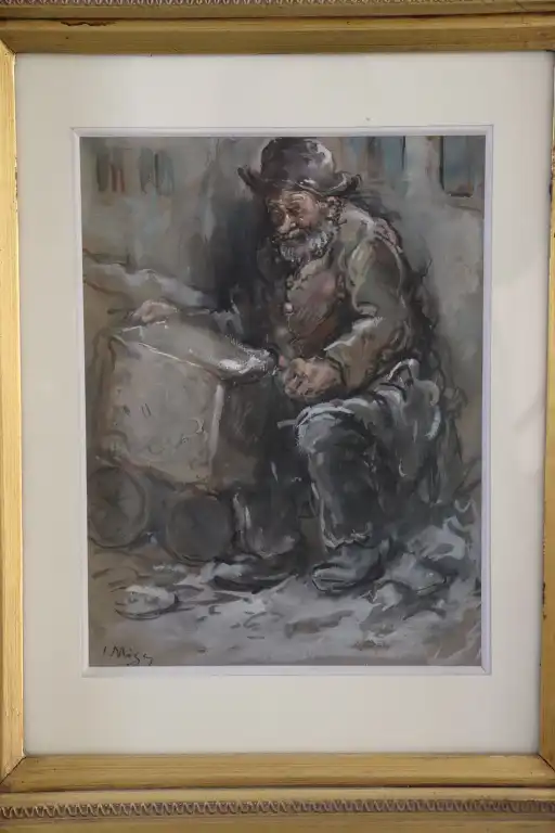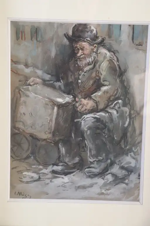 Isabelle MEGE (1878-1910). Le marchand de marrons. Aquarelle et gouache, signée en bas à gauche. 30 x 22 cm. Important cadre doré à canaux.