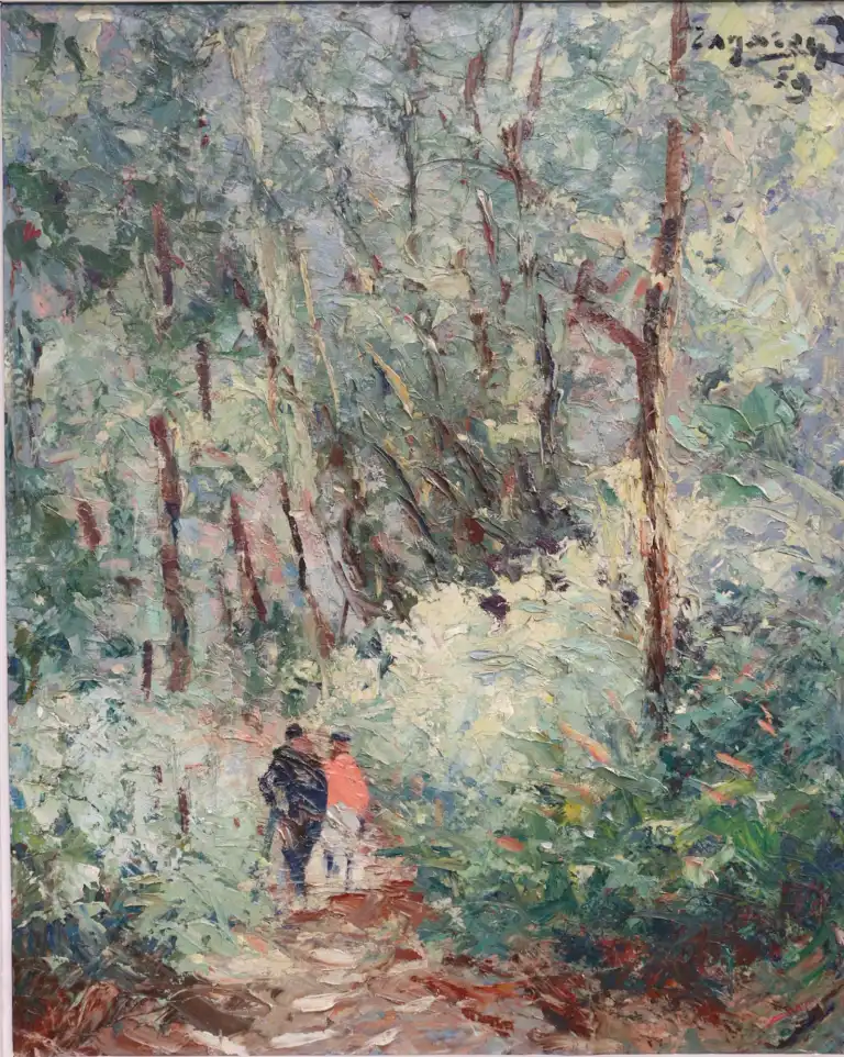 Prudent POHL-ZANAROFF (1885-1966). Promeneurs en forêt, 1959. Huile sur isorel, signée en haut à droite. 61 x 50 cm