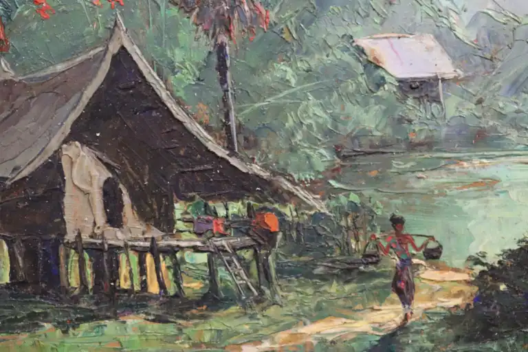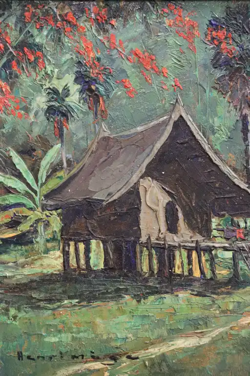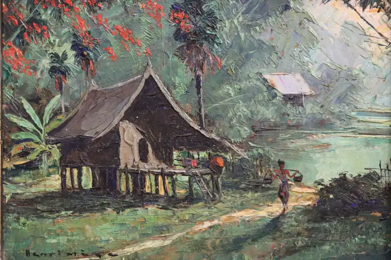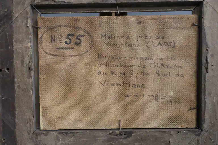 Henri MEGE (1904-1984). Matinée près de Vientiane, Laos, 1952. Huile sur isorel, signée en bas à gauche, contresignée, titrée et datée au dos. 16 x 22.5 cm