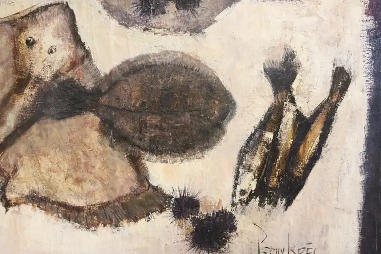 Pierre PEGUY-BRES (né en 1938). Nature morte à la raie. Huile sur toile, signée en bas à droite. 60 x 92 cm