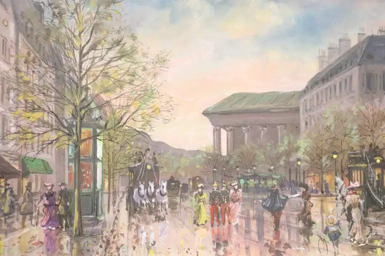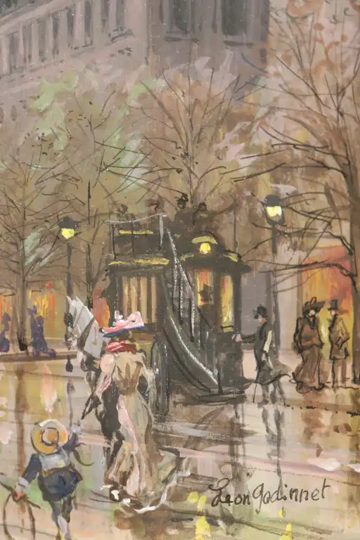 Léon GODINNET (1925-1989). Paris, Boulevard de la Madeleine. Gouache et crayon, signé en bas à droite. 20 x 32.5 cm à vue