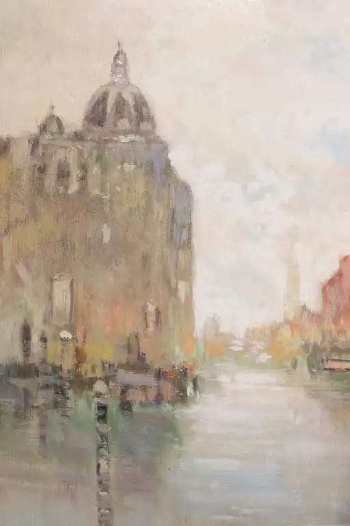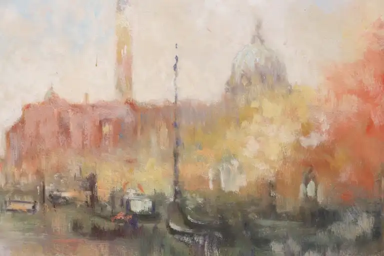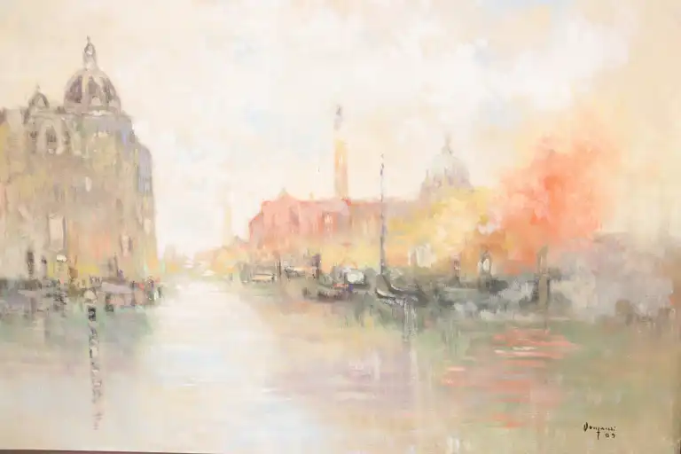 DENFARDI (Ecole du XXIème siècle). D'or et pourpre (Venise). Huile sur toile, signée et datée 09 en bas à droite. 50 x 50 cm.