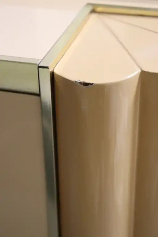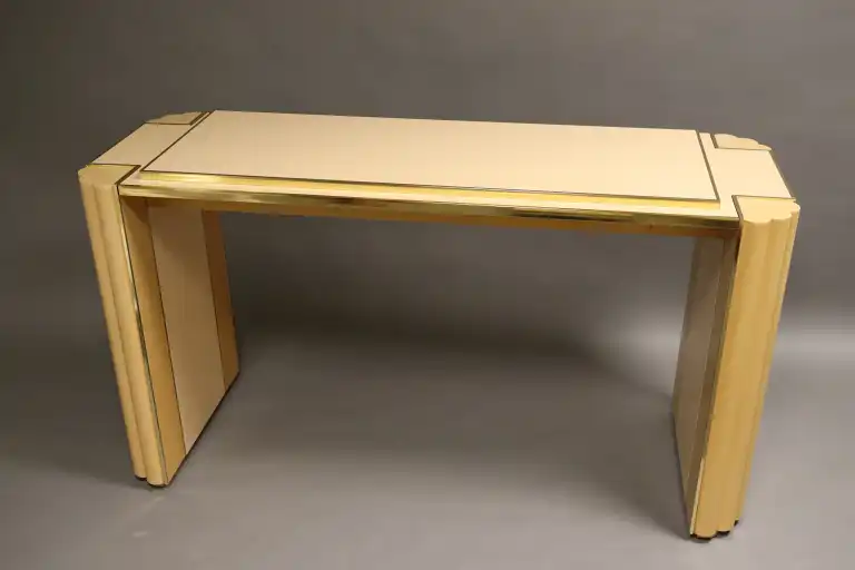 Mario SABOT. Série Alain Delon. MAISON JANSEN. Console laquée beige et baguette de laiton. Monogramme AD Alain Delon sur la base. H. : 74 cm L. : 140 cm P. : 51 cm. (Petits éclats)