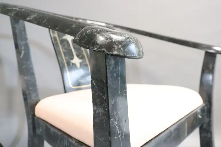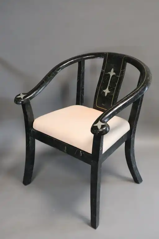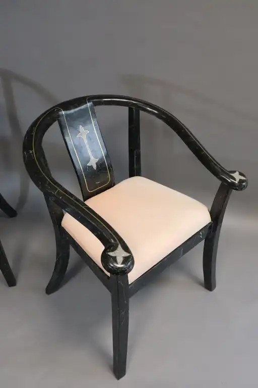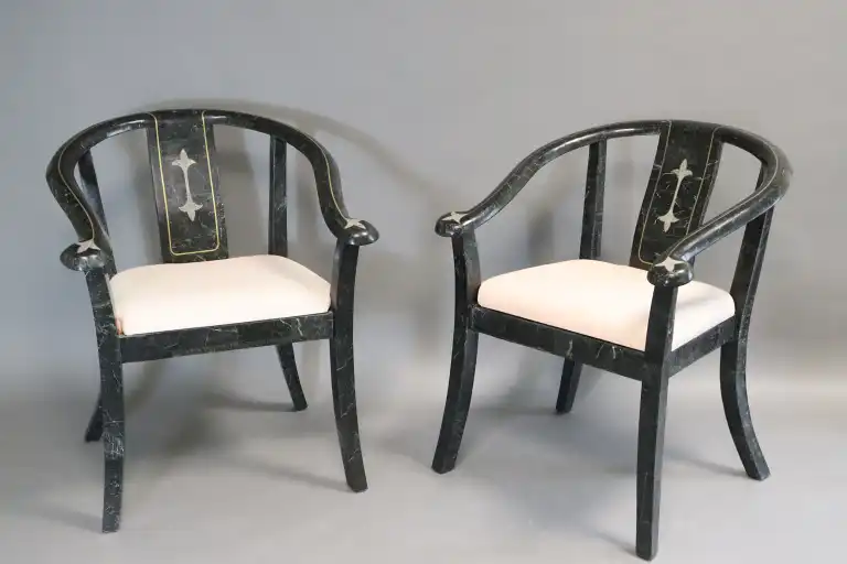 MAITLAND SMITH. Paire de fauteuils recouverts de plaquettes de marbre noir veiné blanc, à décor incrusté de fleurons, les dossiers arrondis soulignés d'un filet de laiton doré. Travail des années 1970. H.: 79 cm - L.: 64 cm - P.: 65 cm. (Petit manque sous un accotoir et à l'arrière d'un pied)