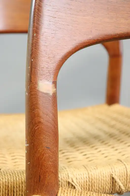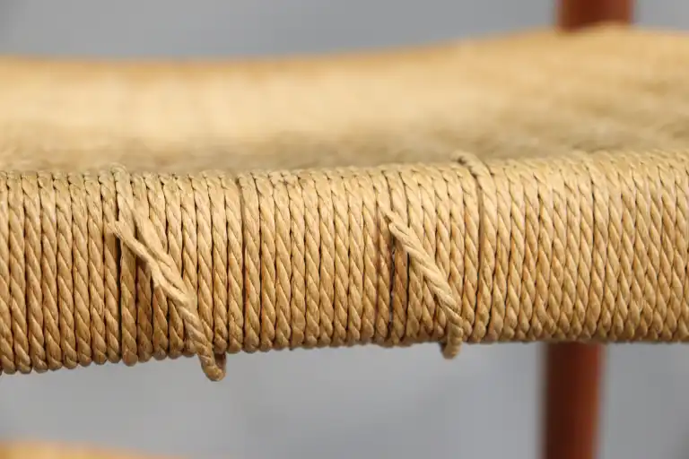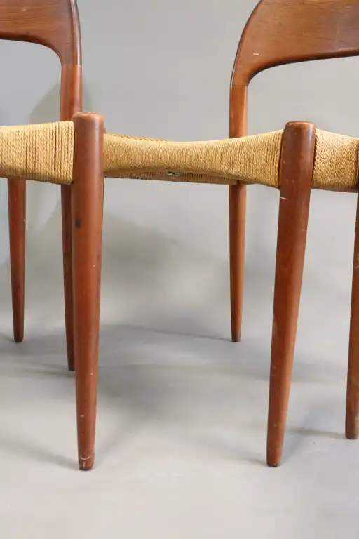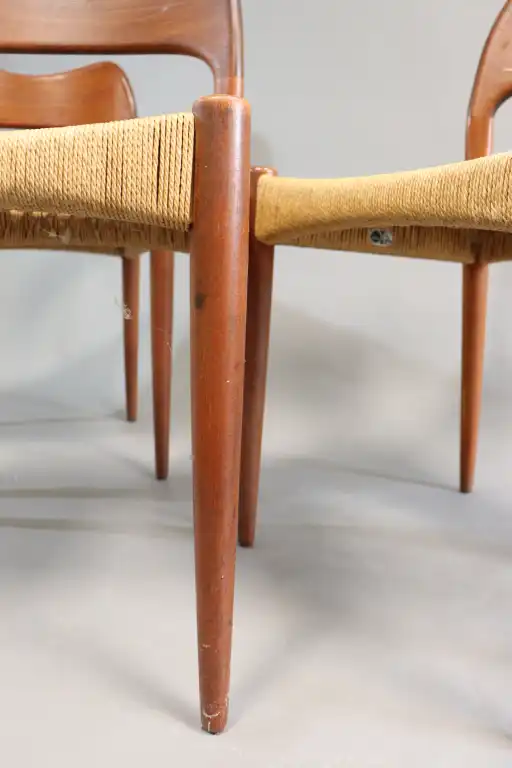 Arne HOVMAND-OLSEN (1919-1989). MOGENS KOLD Craftsmanship Denmark Editeur. Suite de quatre chaises en bois, assises en corde tressée. Etiquette. H.: 76 cm. (Usures, petites taches)