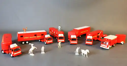 SOLIDO VEREM. Ensemble de 9 camions et 2 voitures, caravanes et remorques (RENAULT, MERCEDES, LAND ROVER, RANGE ROVER) Cirque Arlette Gruss avec ses petits personnages. Le tout sous boîte.