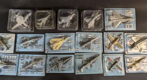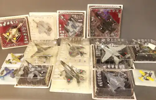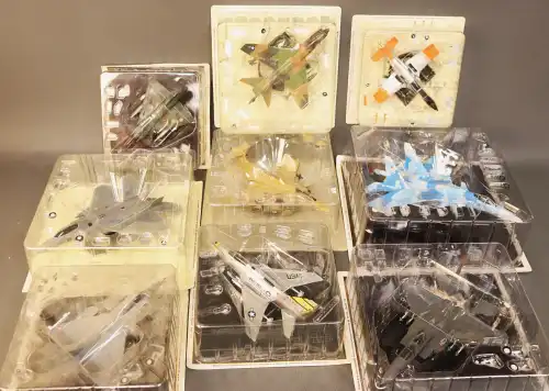 Lot de 23 avions militaires en métal avec parties plastiques, échelle 1/100è comprenant Phantom II, TB1 Avenger, Grumman F9F-2 Panther, P-40B Tigres Volants, F15 A Eagle, etc.