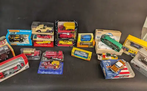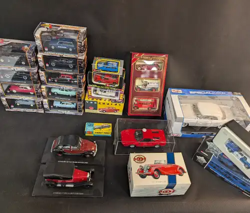 Lot de 21 véhicules, dont CORGI, MATCHBOX, NOSTALGIE, MAISTO, DINKY Collection, VANGUARDS, ONIX. Comprend un modèle 1/18 Chryster Edition spéciale.