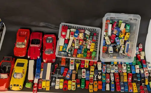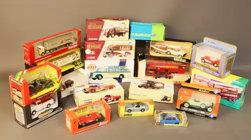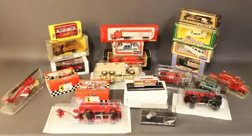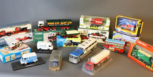 Lot de 21 véhicules : camions, voitures, bus, camion de pompier, tramway, voiture de course Ferrari, sous boîte. Dont : ARAT, SOLIDO, VEREM, CORGI, ERTL.