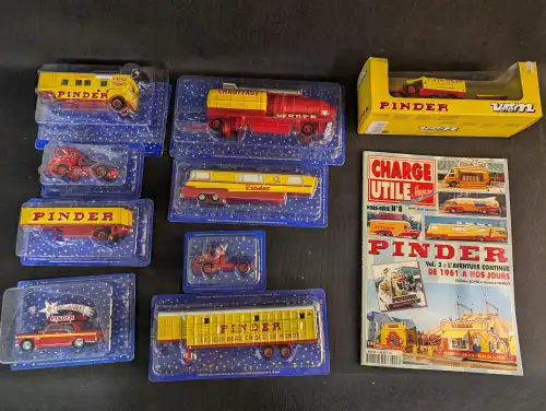PINDER, Lot de 9 véhicules et un magazine sur le thème du cirque Pinder. Dont marque VEREM. Sous boîte avec une boîte ouverte. En l'état.