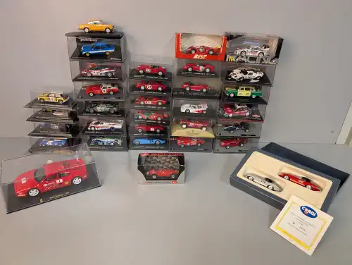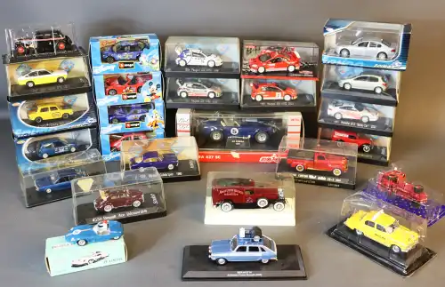 Lot de 26 voitures dont SOLIDO, BBURAGO DISNEY COLLECTION, MAJORETTE (AC Cobra, voitures de rallye, Porsche, Opel, Peugeot, Renault, Citroën...). Toutes sous boîte sauf une.