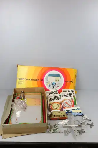 Lot comprenant : Le TIRKILL (en boite) - Radio Construction Kit, Philips - Die Cast Métal, 4 avions sous blister - CORGI, Van Parmalat - Majorette Bus Air France - CORGI, Voiture lessive Saint Marc - Auto-Rail Bugatti mécanique avec sa clef - Lot d'avions dont MERCURY, SOLIDO, DINKY TOYS,