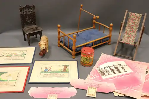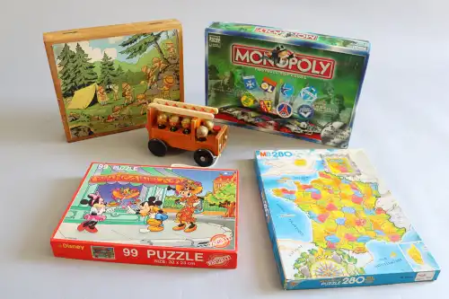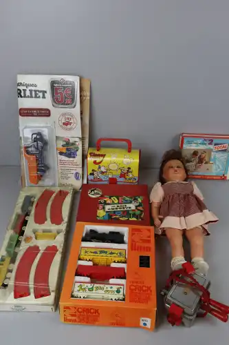 Lot comprenant : poupée SGDC France n42, yeux bleus dormeurs - jeu en bois " Les Bois de Megève"- valise Disney Babies - Educo, Les Jouets Lardy - Lima, coffret cirque - Jouets Mont-Blanc, station Total en boite - gauffrier électrique - Camion Berliet, Hachette, sous blister.