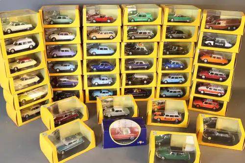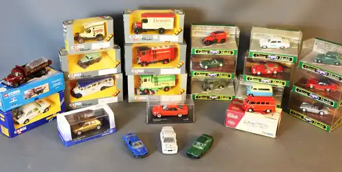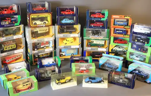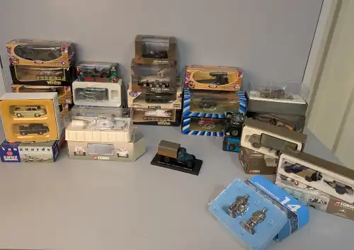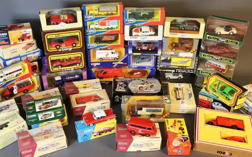 CORGI. Lot de 46 véhicules dont : édition limitée Collection Héritage, classics, classics models, Trucks (007, véhicules publicitaire, polices, bus, vans, camions...). Le tout sous boîte.