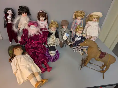 On joint une tête en porcelaine de Pierrot, une poupée en tissu et un cheval ancien (sans roulettes et très usé)