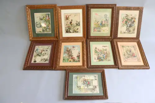 Lot de neuf impressions de contes illustrés pour enfant. Cadres en bois.