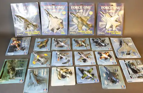 Lot de 20 avions et hélicoptères militaires ERTL Force One, ITALERI ainsi qu'un avion en métal avec parties plastiques comprenant F-15 Eagle, F-18 A Hornet, MIG-17 F "Fresco-C", etc.
