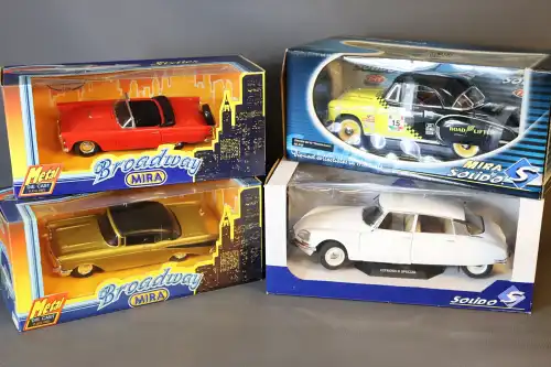 SOLIDO, MIRA. Lot de 4 voitures dont Chevrolet Bel Air (1950) "Panamericaine", Citroën D Spécial, Ford Sunderbird (1956), Chevrolet (1957).