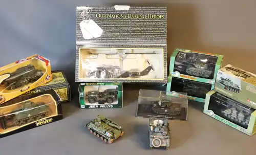 Lot de 18 véhicules militaires VEREM, UNIMAX, EASY MODEL, NEW RAY, sans marques. Chars d'assaut, hélicoptères, avion de chasse, navire.