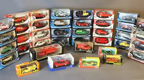 SOLIDO. Lot de 39 véhicules miniatures dont deux VEREM (Peugeot, Renault, Citroën, Fiat, Simca, Aston Martin, Land Rover, Mini, BMW, véhicules de pompier, voiture de course), tous sous boîte.