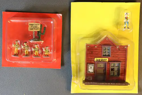 On joint deux boîtes de figurines Lucky Luke (devanture "Sheriff" et les Daltons).