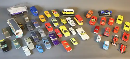 Lot de 47 véhicules miniatures dont SOLIDO, MATCHBOX, MAISTO, POLITOYS EXPORT, CORGI, PEUGEOT, F1 FERRARI (2002 et F126 C2) etc. ...
