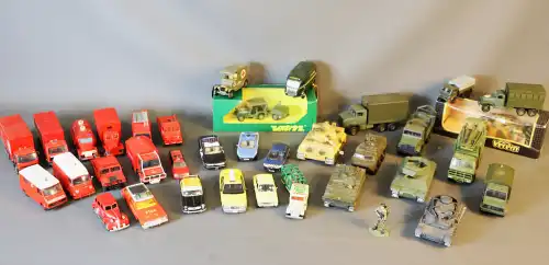 Lot de 35 véhicules miniatures et d'une figurine militaire de marque SOLIDO, MATCHBOX, CONRAD, VEREM (sous boîte), dont pompiers, ambulance, gendarmerie, police, militaire, taxi, safari.