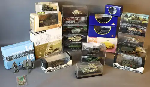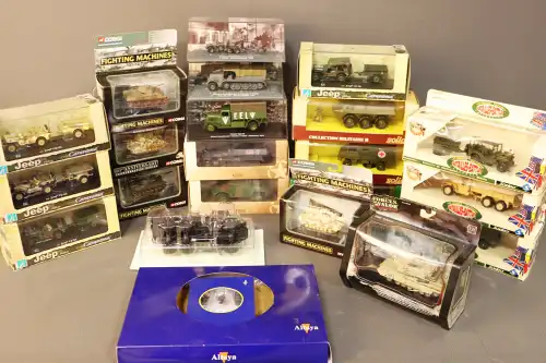 Lot de 20 véhicules militaires : chars, camions, voitures..., dont : CORGI, CARARAMA, FORCES OF VALOR, SOLIDO, EDITIONS ATLAS, VEREM.