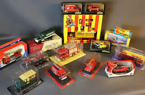 Lot de 14 véhicules miniatures comprenant : - SOLIDO (dameur pompier, camion bétaillère, camion citerne émulseur, Service départemental incendie et secours RENAULT) sous boîte ;