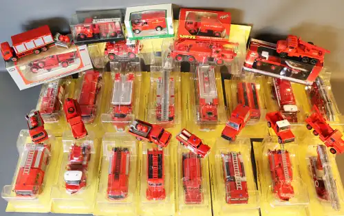 Lot de 32 véhicules de pompiers (avec et sans boîtes) dont HACHETTE COLLECTION, SOLIDO, VEREM, CARARAMA, 3HC...