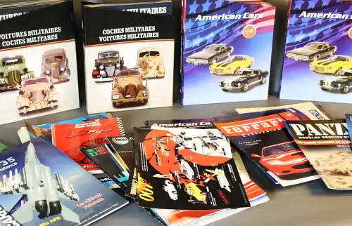 Lot de magasines automobiles et militaires (tailles réelles et miniatures) : AMERICAN CARS, SOLIDO, CORGI, ELIGOR, FERRARI, ALTAYA, etc.