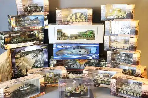 Lot de 20 véhicules militaires. Dont SOLIDO, VEREM, D-DAY, CORGI, VANGUARDS. Sous boîte (une boîte manquante).