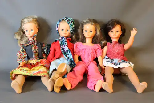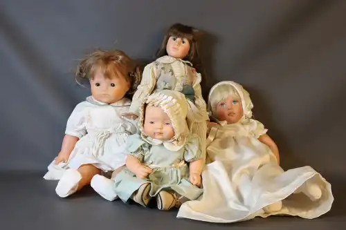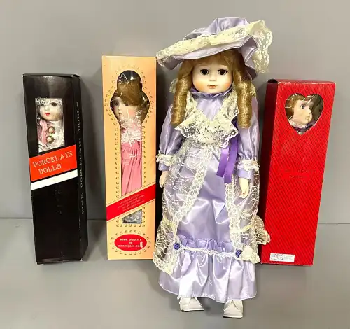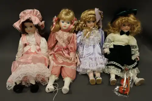 Lot de quatre poupées en porcelaine et tissus, semi-articulées, yeux ouverts, bouches fermées. Une poupée représentant une violoniste avec son violon, une deuxième poupée à robe rose, une troisième à robe violette et la quatrième à tenue rose. Dans leurs boîtes d'origine. H. : 40 à 45 cm