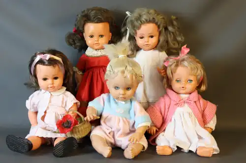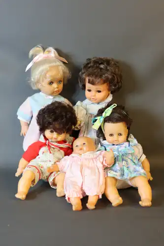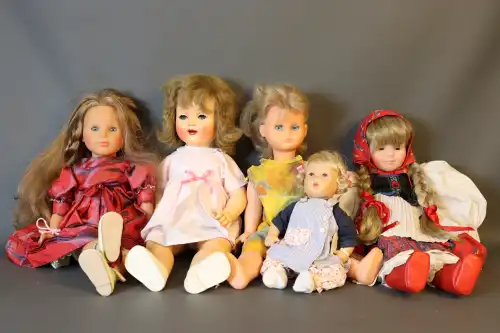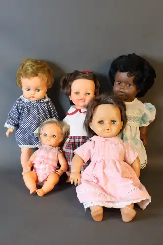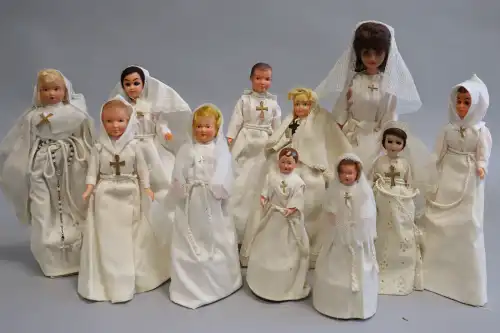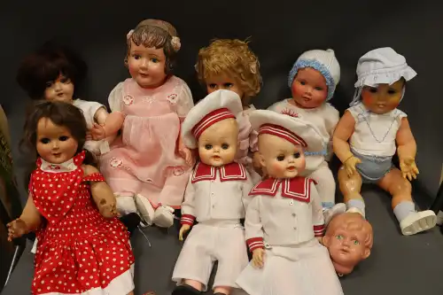 Lot de huit poupées comprenant : 2 poupons en plastique en habits de marin, taille : 49 et 50 cm ; Convert, Nano, 2 grands baigneurs en celluloïd, taille : 56 cm (usure et fêle à l'un) ; une poupée en celluloïd marquée "Made in Japan, H entouré d'une étoile", visage peint. Taille : 59 cm ; une grande poupée en carton bouilli, sans marque, yeux dormeurs, bouche ouverte sur quenottes, taille : 61 cm. ; deux grandes poupées en celluloïd, yeux dormeurs, bouche fermée, sans marque apparente. Taille : 59 et 62 cm (petites usures).