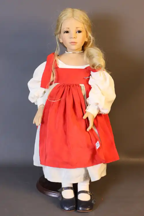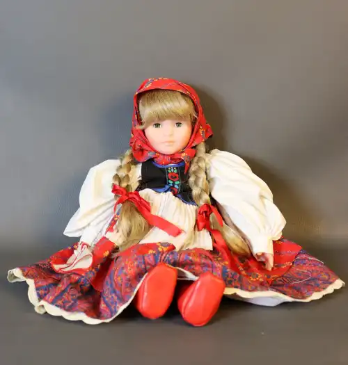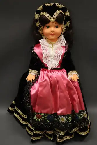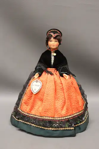 Poupée en plastique dur et tissus, semi-articulée, yeux dormants, bouche fermée en tenue traditionnelle savoyarde. Années 1990. Dans sa boîte d'origine. H. : 44 cm à vue